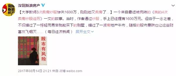 当时,身为大学老师的作者3次卖房炒股,令原本手中握有的1600万元灰飞烟灭。同时也错过了一栋轻而易举就能买下的别墅,也痛失一波房地产牛市。