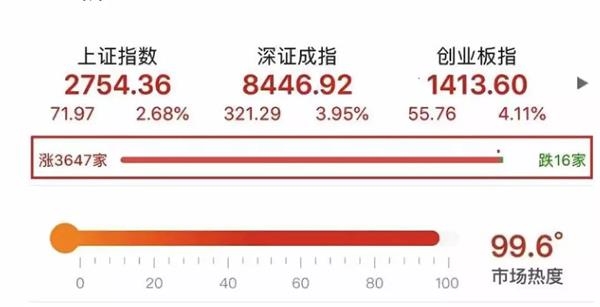 2月18日,A股市场的热度更是一度接近“沸腾”,市场各大热点全面开花,沪指收涨2.68%,深成指收涨3.95%,创业板指收涨4.11%。两市上涨个股达3647只,下跌个股仅16只,市场“热度”高达99.6℃,即99.6%的股票实现上涨,只差0.4%,A股市场就实现“沸腾”。