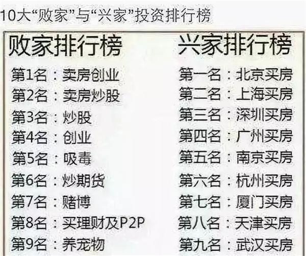 甚至当时网上还有段子列出了10大败家和兴家投资排行榜,卖房炒股和卖房创业位居败家排行榜第一、二位;而兴家排行榜则是清一色的买房,区别只是在一线还是二线城市。