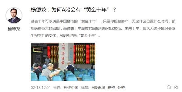 杨德龙表示,过去十年可以说是中国楼市的“黄金十年”,只要你投资房产,无论什么位置什么时间,都能获得巨大的回报,而过去十年股市的回报则相对比较低。未来十年,我认为这种情况会发生根本性的变化,A股将迎来“黄金十年”。