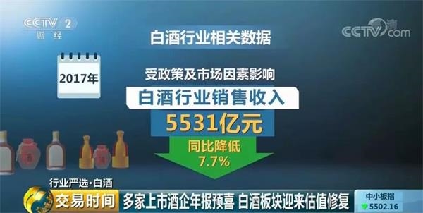 2017年,受政策及市场因素影响,白酒行业销售收入为5531亿元,同比降低7.7%。