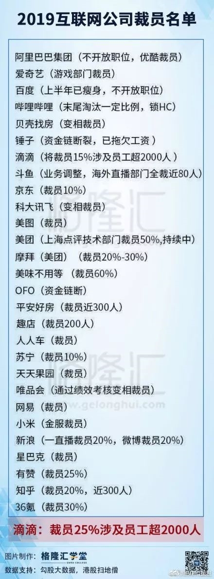 除了这些近期被爆裁员的企业外,此前网络上流传着一张2019年初各大互联网公司裁员图,涉及阿里巴巴、爱奇艺、百度、哔哩哔哩、人人车、斗鱼等近30家公司。