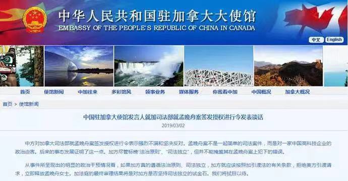 对此,中国驻加拿大使馆发言人表示:中方对加拿大司法部就孟晚舟案签发授权进行令表示强烈不满和坚决反对。孟晚舟案不是一起简单的司法案件,而是对一家中国高科技企业的政治迫害。后来的事态发展证明了这一点。加方尽管标榜“法治原则”、“司法独立”,但并不能掩盖其在孟晚舟案上犯下的错误。