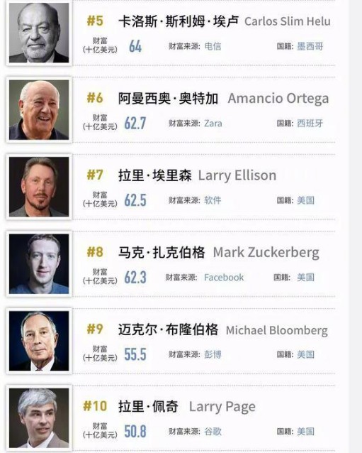 3月7日早间消息,《福布斯》日前发布第33期年度全球亿万富豪榜,列出了全球最富有的人士。据榜单显示,不久前经历了离婚风波的亚马逊创始人杰夫·贝索斯(Jeff Bezos)以1310亿美元的身价蝉联全球首富,比尔·盖茨(Bill Gates)和沃伦·巴菲特分别以965亿美元、825亿美元位居第二、第三名。其中,Facebook CEO马克·扎克伯格(Mark Zuckerberg)在经历了艰难的2018年后,以623亿美元位列第8名,个人净资产比去年缩水了90亿美元,排名下滑了3位。