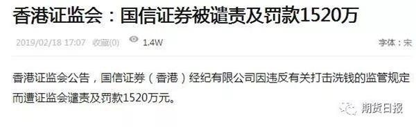 前段时间,国信证券(香港)因在处理第三者资金存款时没有遵守有关打击洗钱及恐怖分子资金筹集的监管规定,被香港证监会谴责并罚款1520万港元。据香港证监会披露,国信证券(香港)在2014年11月至2015年12月处理的第三者存款出现明显的打击洗钱及恐怖分子资金筹集预警迹象,涉及总额约50亿港元。