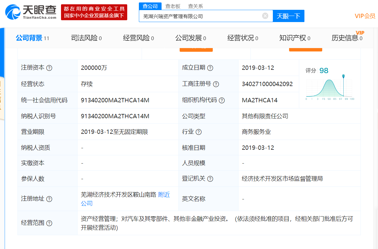 北京时间3月15日消息,据天眼查数据显示,近日,奇瑞汽车股份有限公司新增对外投资,并成立资本投资公司“芜湖兴瑞资产管理有限公司”。