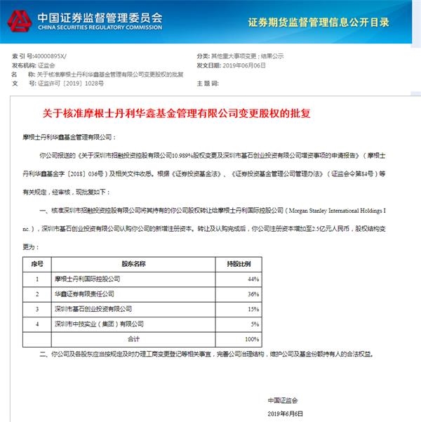 摩根士丹利华鑫基金股权变更获批 首家外资相对控股公募出炉